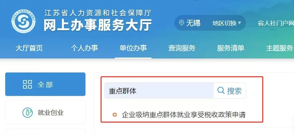地區(qū)切換選擇“無錫”,企業(yè)吸納重點群體就業(yè)享受稅收政策資格認(rèn)定選擇:單位辦事—就業(yè)創(chuàng)業(yè)—企業(yè)吸納重點群體就業(yè)享受稅收政策申請—申報。